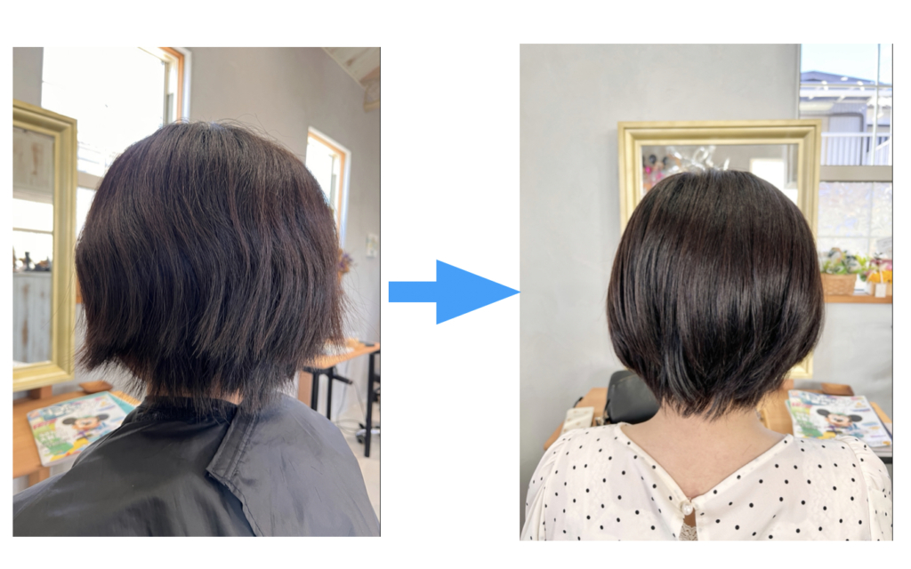 中間の大きなうねりが消えるため、何もしなくてもシルエットが綺麗に仕上がる。毛先も全てはねていたのが内に入るので毛先が収まらない心配も解決できた。ツヤもしっかりでた。