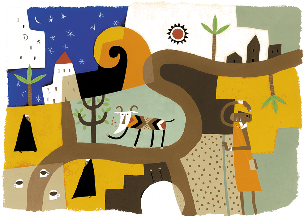 アラビア人のカルディという山羊飼いはエチオピアの草原で放牧生活をしていました。ある日、気がつくと、自分の山羊が楽しそうに飛んだり跳ねたりしています。そこで調べてみると、あたりに茂っている木になった真っ赤な実を食べていることがわかりました。そこで自分も食べてみると、とても爽快な気分になります。カルディは山羊と一緒に毎日この赤い実を食べ、元気に楽しく働いていました。あるとき、通りかかったイスラム教の僧侶がカルディたちの様子を見て赤い実の不思議な力にびっくりし、これを僧院に持ち帰り、仲間の僧侶たちにも食べさせたところ、甘ずっぱいおいしさに加えて、眠気がとれ爽やかな気分に。それ以来みんなすっかり魅せられ、魔法の豆として、密かに愛用されるようになったということです。