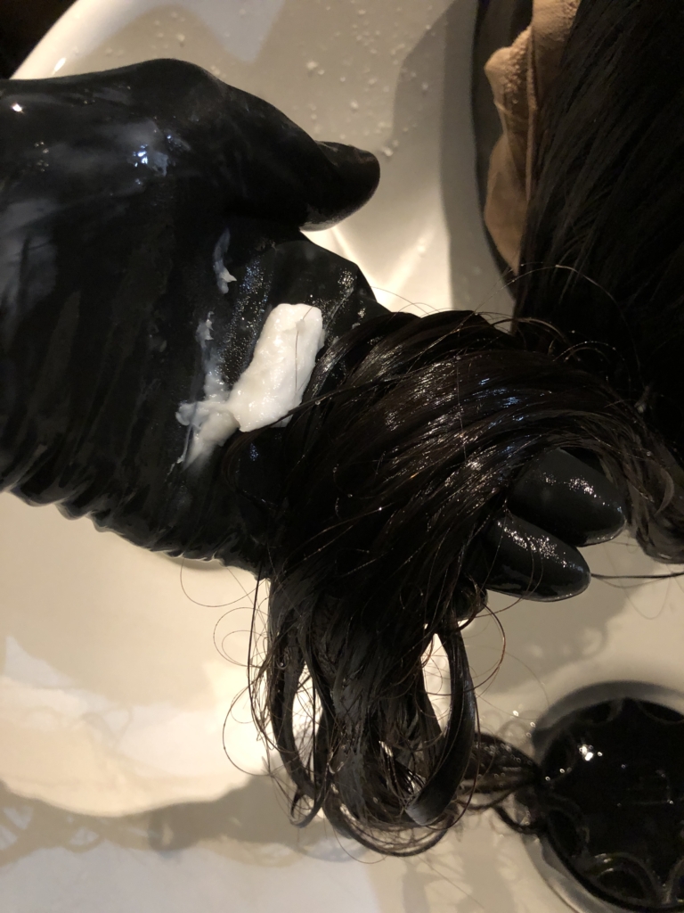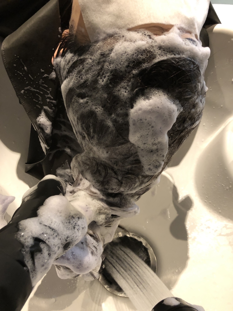 ・乳化(中間処理)…いきなり流すのではなく、お湯とカラー剤を徐々に馴染ませていきます。こうすることでカラー剤が髪の内部にしっかり浸透し、色もちにも影響が出る大事な工程です。ダメージの状況によりここでトリートメントをつけることもあります。